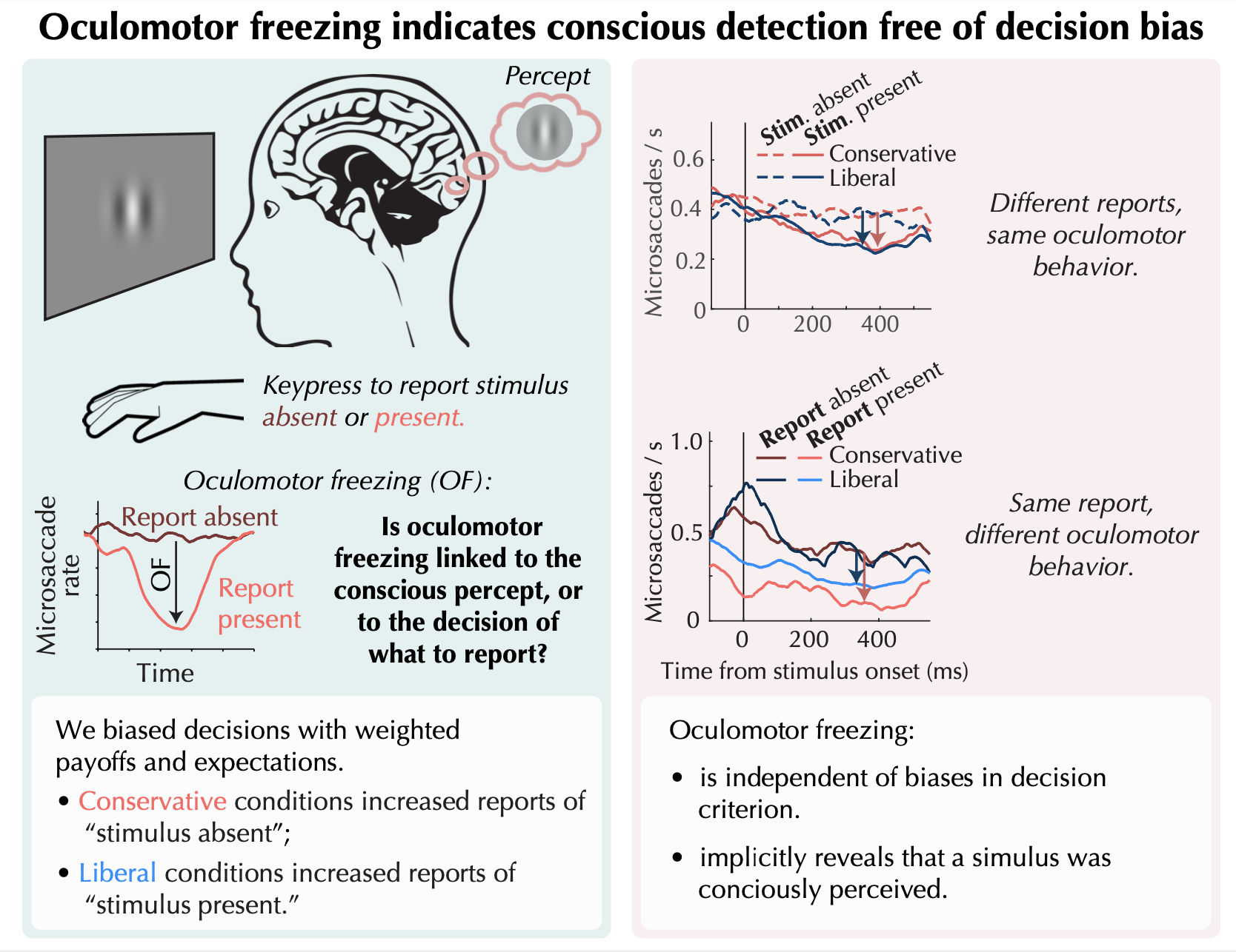 The same visual stimulus can sometimes reach awareness, while other times it does not. To understand why, we need objective, bias-free measures of awareness. We had previously discovered that a reflexive freezing of small eye movements indicates when an observer detects a stimulus (see White & Rolfs, 2016). In a new set of experiments that is now accepted for publication in the Journal of Neurophysiology we now biased observers’ decisions to report seeing the stimulus. Despite large changes in observers’ response behavior, the oculomotor response was unaltered. This suggests that the threshold for conscious perception is independent of the decision criterion and is revealed by oculomotor freezing.